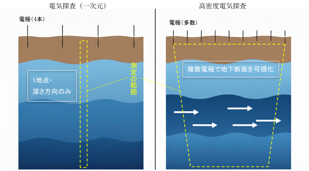 しかし1990年代以降は、計測技術と解析技術の進歩により、地下を“断面(二次元)”で可視化する高密度電気探査が主流となっています。