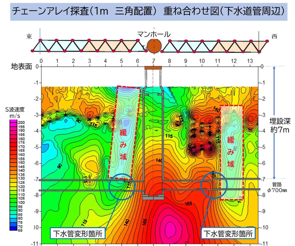 この事例では深度7m付近に埋設されている下水道マンホール周辺を対象にチェーンアレイ探査を実施したところ、Vs(S波速度)が周囲よりも極端に小さい領域が、縦方向に連続する構造として現れました。