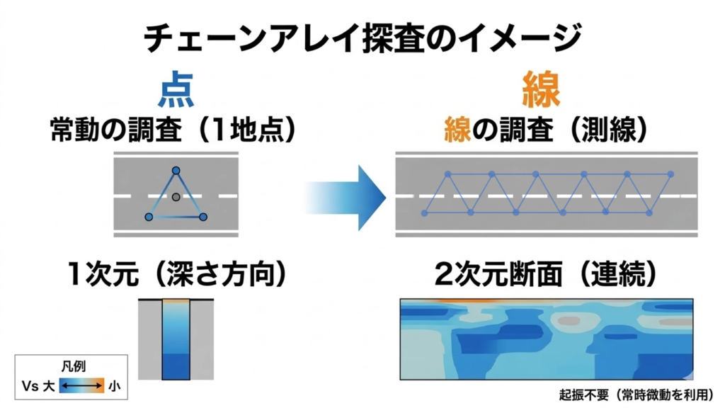 そこで用いられるのが、微動アレイ探査を発展させた「チェーンアレイ探査」です。