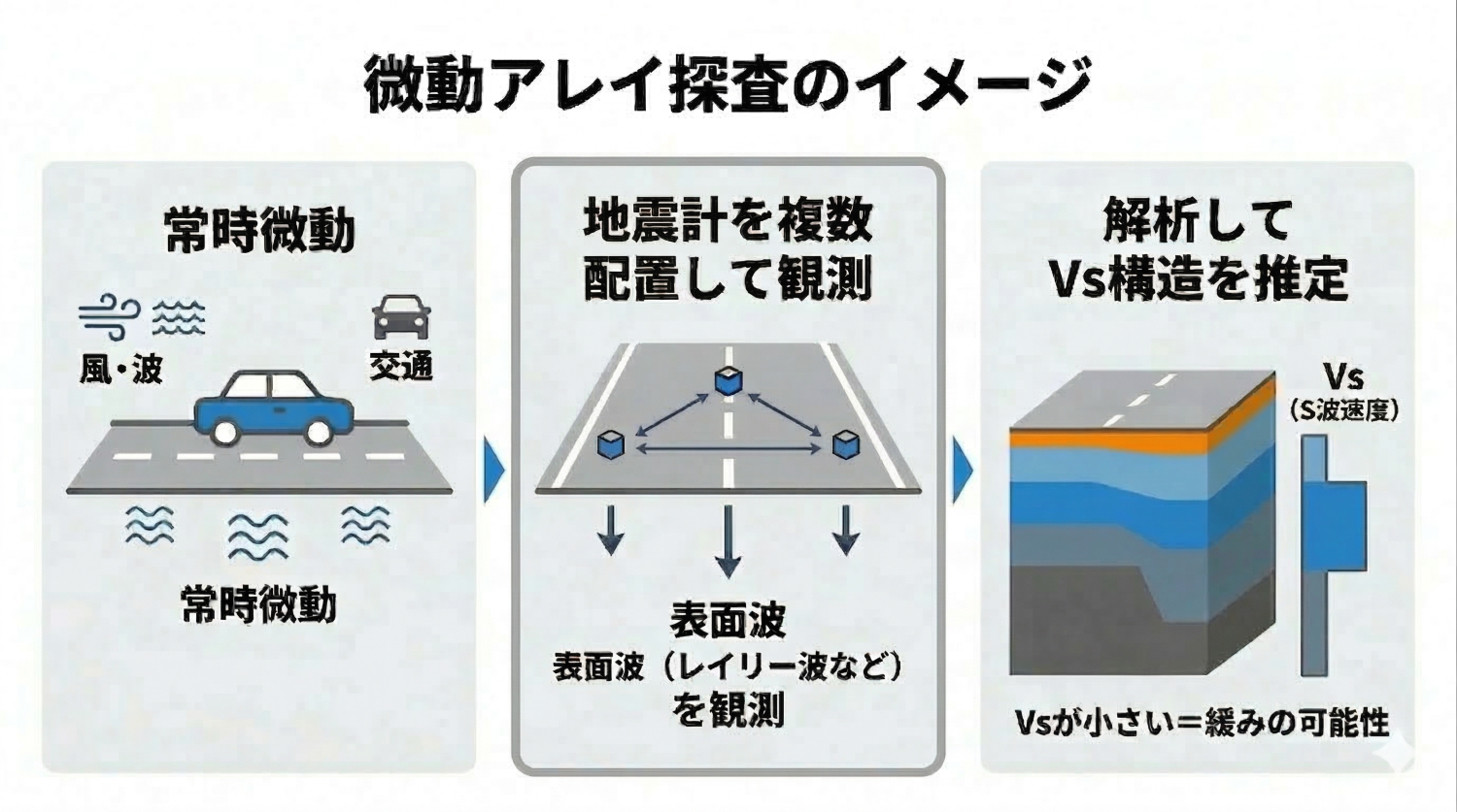 微動アレイ探査・チェーンアレイ探査は、地盤を掘削することなく、目に見えない地下の状態(特にVs(S波速度)=地盤の硬さの目安)を把握できる非破壊調査手法です。