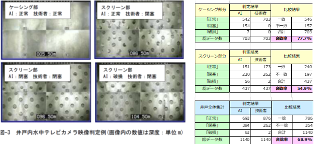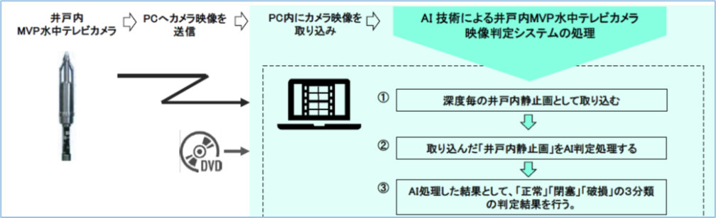 従来は、水中テレビカメラで井戸内を撮影し、熟練技術者が映像を目視で確認しながら、地下水取水部の「正常」「破損」「閉塞」といった状態を判定してきました。